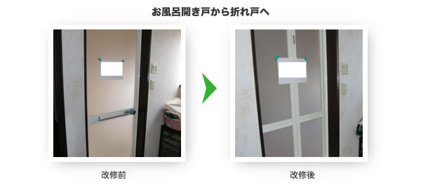 開き戸を引き戸、折戸、アコーディオンカーテン等に取り替えるといった扉全体の取替えのほか、扉の撤去、ドアノブの変更、戸車の設置等も含まれる。※平成21年4月10日より、「引き戸等の新設」が「引き戸等への扉の取り替え」に含まれ、給付対象となった。(引き戸等の新設により、扉位置の変更等に比べ費用が低廉に抑えられる場合)。 |
