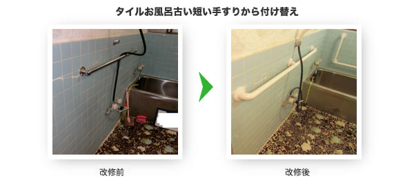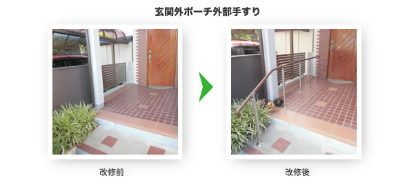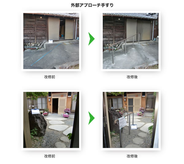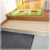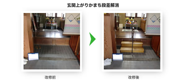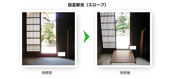 居室、廊下、便所、浴室、玄関等の各室間の床の段差及び玄関から道路までの通路等の段差又は傾斜を解消するための住宅改修をいい、具体的には敷居を低くする工事、スロープを設置する工事、浴室の床のかさ上げ等が想定されるものである。 【対象外】福祉用具貸与「スロープ」または福祉用具購入「浴室内すのこ」を置くことによる段差の解消は除かれる。また、昇降機、リフト、段差解消機等動力により段差を解消する機器を設置する工事は除かれる。 |