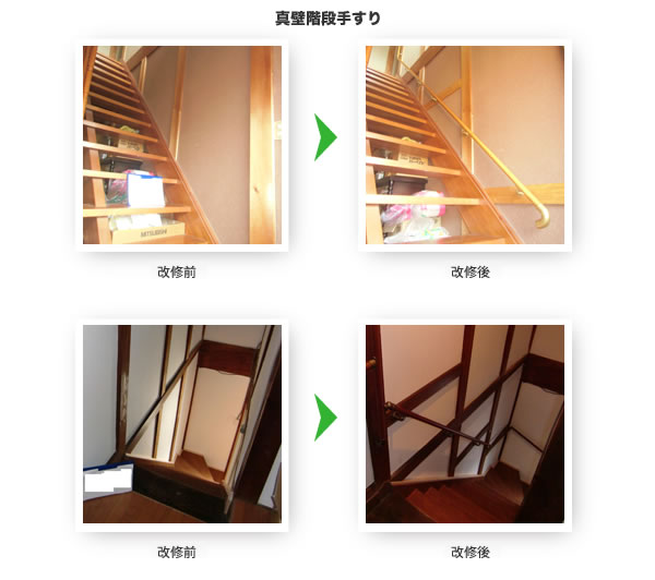 廊下、便所、浴室、玄関、玄関から道路までの通路等に転倒予防もしくは移動又は移乗動作に資することを目的として設置するものである。手すりの形状は、二段式、縦付け、横付け等適切なものとする。 |